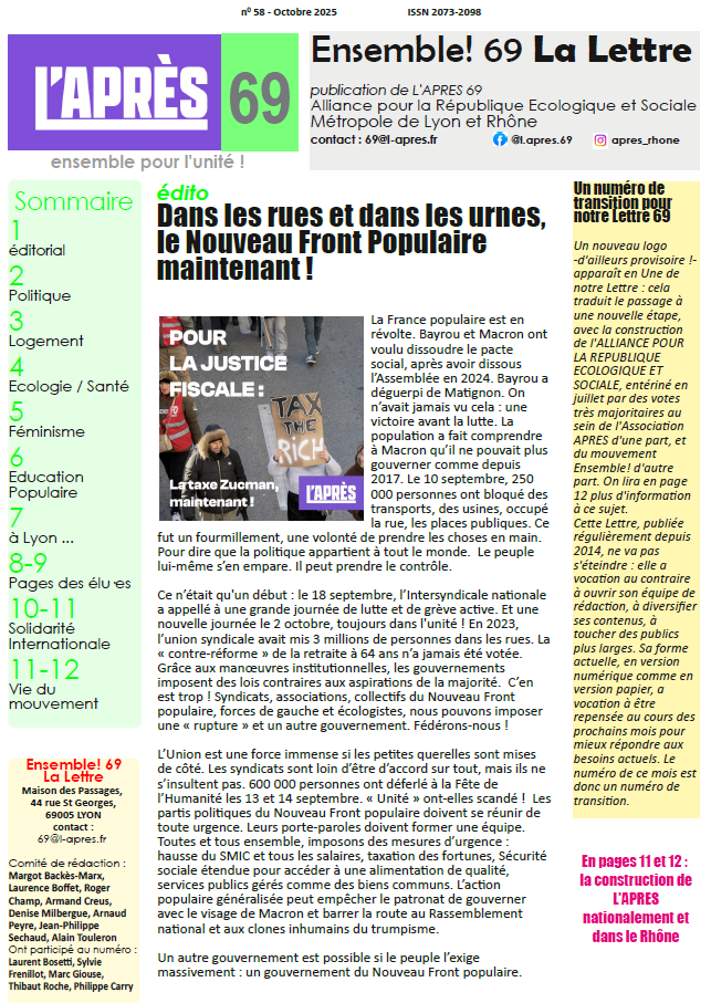 * SAMEDI 6 SEPTEMBRE : MARCHE POUR GAZA et LA PALESTINE - Stop génocide, des sanctions contre Israël15h - départ place Bellecour* LUNDI 8 SEPTEMBRE : Vote de la motion de confiance au gouvt Bayrou à l'Assemblée ! "pot de départ de Bayrou" aux Terreaux en soirée* MERCREDI 10 SEPTEMBRE : journée "Indignons-nous / Bloquons tout !"Nombreuses initiatives* JEUDI 18 SEPTEMBRE : Journée de mobilisation intersyndicalegrève et manifestations